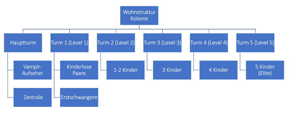 Die Organisation der Kolonie war eine weitere große Herausforderung für mich. Ich musste mir haargenau aufschreiben und mindmappen, wie die Gebäude untergliedert sind und welchen Zweck welches Level der Kolonie hat. Auch welche Frisur zu welchem Level gehörte, war etwas, was ich selbst beim Schreiben immer wieder nachschauen musste, um keine Fehler zu machen. Vieles davon ist während des Schreibprozesses entstanden. Die Level gab es zu Beginn gar nicht und kamen erst bei der ersten Überarbeitung des Manuskriptes zustande.