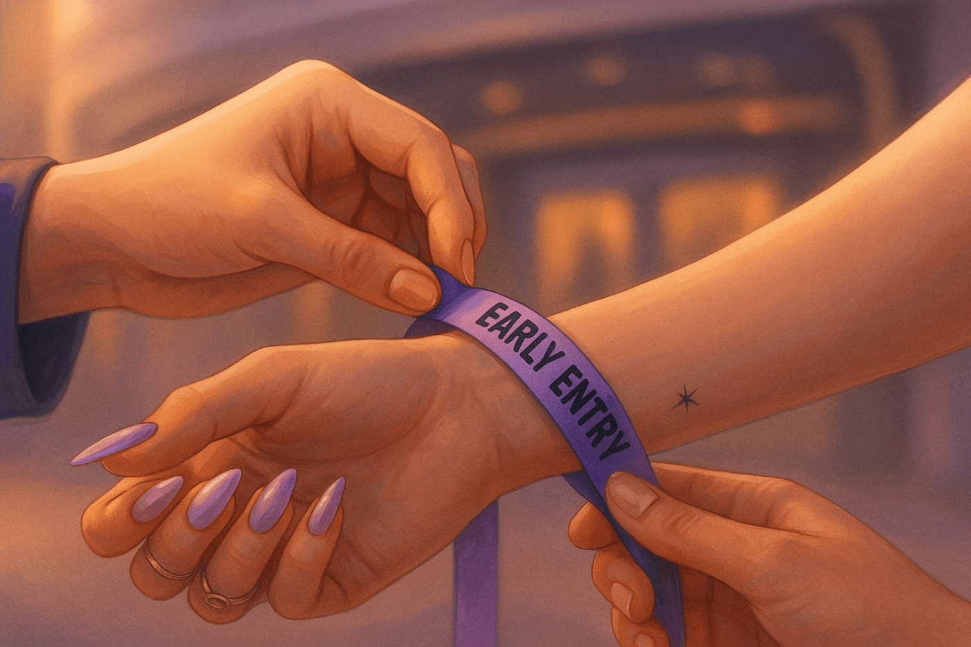 - Bändchen / Wristband: Nachweis am Handgelenk, dass du z. B. zu Early Entry/VIP gehörst.